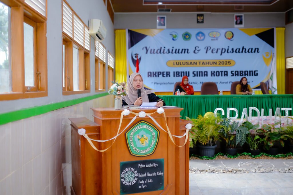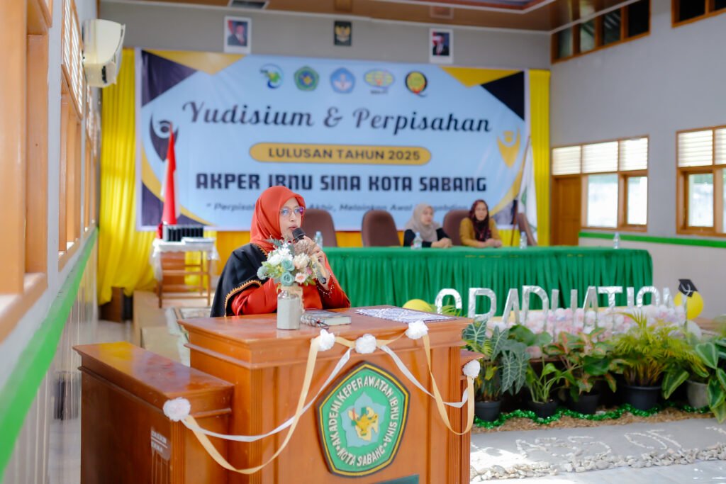 Direktur Akademi Keperawatan Ibnu Sina Kota Sabang Aida Khairunisa, S.S.T., M.Si dalam sambutannya menyampaikan apresiasi dan kebanggaan kepada seluruh peserta yudisium yang telah berhasil menyelesaikan proses pendidikan dengan penuh dedikasi dan ketekunan.Direktur menegaskan bahwa lulusan Akademi Keperawatan Ibnu Sina Kota Sabang tidak hanya dibekali kompetensi akademik dan keterampilan klinik, tetapi juga nilai-nilai kemanusiaan, etika profesi, serta semangat pengabdian kepada masyarakat. Lulusan diharapkan mampu menjadi perawat yang profesional, berintegritas, dan adaptif terhadap perkembangan ilmu pengetahuan serta kebutuhan pelayanan kesehatan.